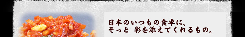 いつもの食卓に、普通にキムチが並べてあって、いろいろなキムチ料理があって・・・そう、私の思いは、日本の食卓においても、キムチは決して特別なものではなく、普段のお食事に気軽に取り入れていただけることです。 |