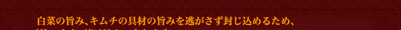(国産) 白菜は、国産の季節ごとの一等品を使用しております。、普通の数倍の時間をかけて下漬けを施し、丁寧に漬けこむ独自の漬け込み方法により、みずみずしく、柔らかい、国産白菜ならではの美味しさを生かした、キムチに仕上げました。国産の白菜を使用しながら、決して水っぽくならず、さらには長く置かれましても、味の変化が少なく、おいしく召し上がっていただけるのは、丁寧な下漬けと、キムチの具材には、一切 水を加えないというこだわりがあるからです。 |