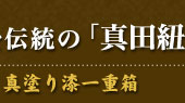 真田紐は組紐と異なり、縦糸の長さ以上に延びないため、ずっしりと重みのあるキムチの入った重箱を支えるのにとても重要な役割をしてくれます。「真田紐」の品格を落とさない、上質の糸を用いて大切に織り上げているという、石川県にある真田紐の専門織元「すみや」さんより取寄せた伝統の木綿100%上質平織紐を用いました。